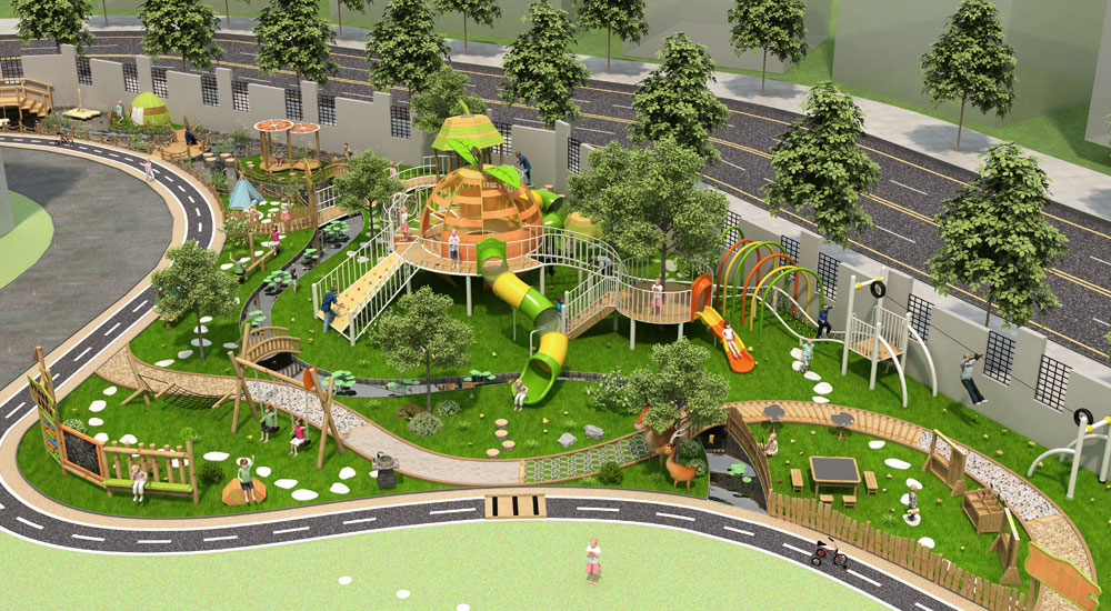 该园所地处丹棱,橙子是丹棱的特产又代表积极向上和阳光。结合幼儿园的办园理念,自然的旅程,探索的伙伴,童梦的乐园,创造一个专属丹棱小朋友的乐园,将橙子作为设计元素贯穿整园户外儿童空间。