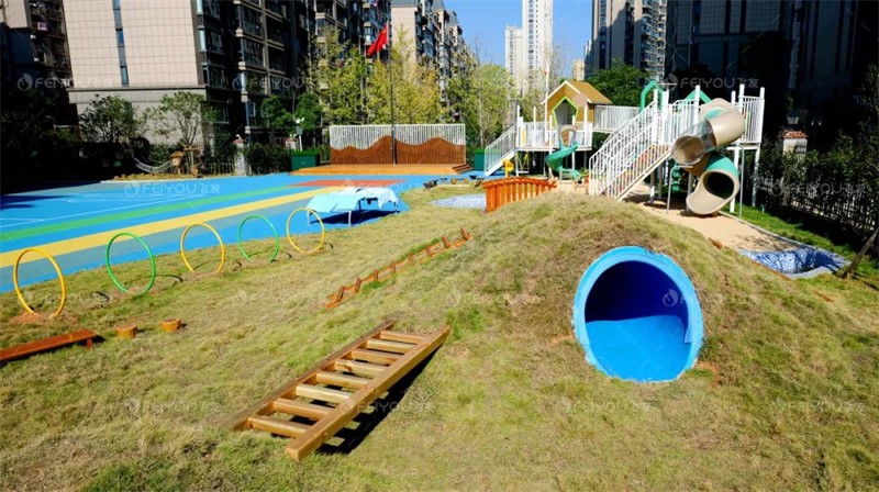 幼儿园环境幽雅、怡静、繁华中取静,公共区域打造了阅读室、美工室、音体室、科学观察室等室内功能区,户外打造了大型游乐设施、沙水区、微地形区、运动长廊、种植区和饲养区等自然天成的游戏场域。
