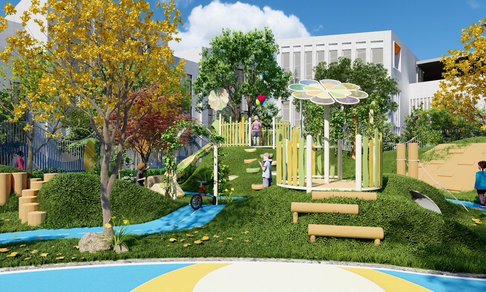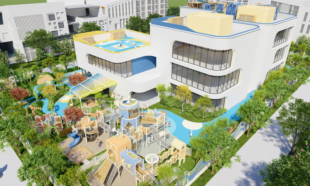 户外综合活动区:滑梯主设备结合沙池与水池进行互动设计。设备内设滑轮打沙系统、风能小风车、阿基米德圆规、双人迷宫等科学游戏,让孩子在玩乐中学习。