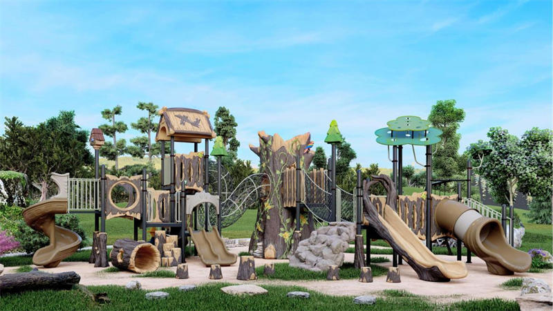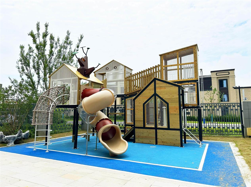 4、户外木质设备:采用防霉防腐工艺处理,适配户外环境,包括木质攀爬架、木质游乐屋等,注重自然风格与安全性。