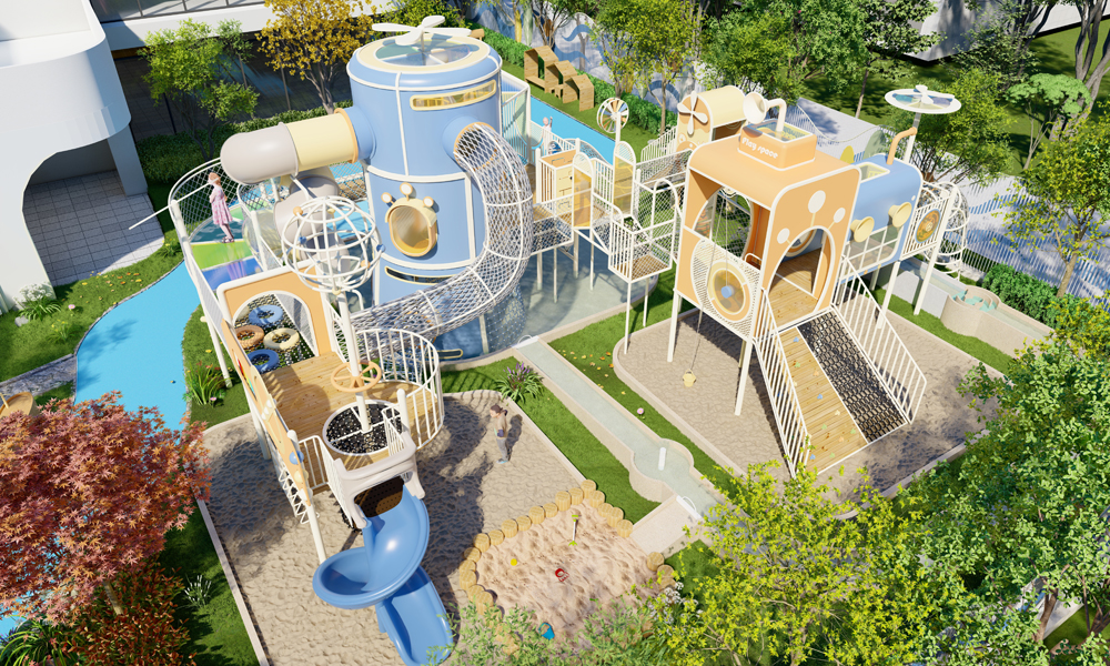 户外综合活动区:滑梯主设备结合沙池与水池进行互动设计。设备内设滑轮打沙系统、风能小风车、阿基米德圆规、双人迷宫等科学游戏,让孩子在玩乐中学习。